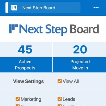 Our Next Step Board application pulls data directly from your CRM system to display your Sales Pipeline, your Active Prospects and your Sales Forecast clearly and accurately. This tool allows leaders to assess teams at a glance, and allows sales counselors to "self-correct" throughout the week. Because all information is updated hourly from your CRM, you can expect full reporting compliance.